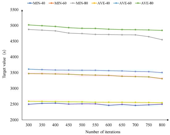 Above, “synchronous loading and unloading” combined with the “pre-assign” task arrangement method (M2) was taken as an example to determine the number of ALNS iterations, which can be resolved according to the following experimental steps: (1) set the number of tasks to 40, 60, and 80 and the corresponding ARMG number to 4, 5, and 5, respectively; (2) set the number of iterations in the ALNS algorithm to 300, 400, …, 800; (3) for the combined calculation example of the number of tasks and the number of iterations, run the ALNS algorithm to solve the calculation example 10 times and return the minimum and average values of the 10 results. The minimum and average values of multiple iterations are shown in Figure 5. The experimental results show that when the scale of the example was 40, that is, when the scale of the example was small, changing the number of iterations basically did not affect the target value. When the scale of the example was 60 and 80, that is, with the number of iterations increasing, the minimum and average values decreased slightly. In the experiments, to compare the scheduling effect, the number of ALNS iterations was set to the same number, 600.