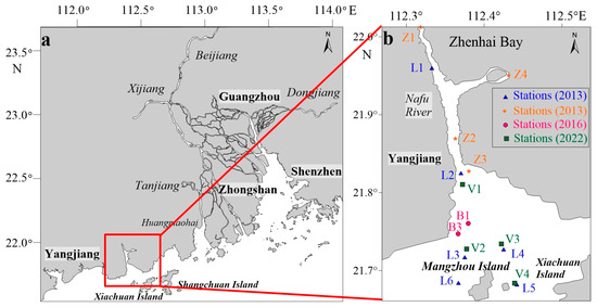 Location of the Zhenhai Estuary in relation to the Pearl River Delta (a) and measurement stations on 12–13 March 2013, 7–10 May 2016, and 12–13 August 2022 (b).