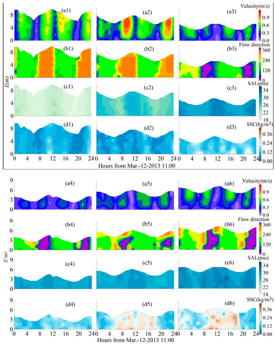 Time series of flow velocity, flow direction, salinity, and sediment concentrations at L1 (a1,b1,c1,d1), L2 (a2,b2,c2,d2), L3 (a3,b3,c3,d3), L4 (a4,b4,c4,d4), L5 (a5,b5,c5,d5), and L6 (a6,b6,c6,d6).