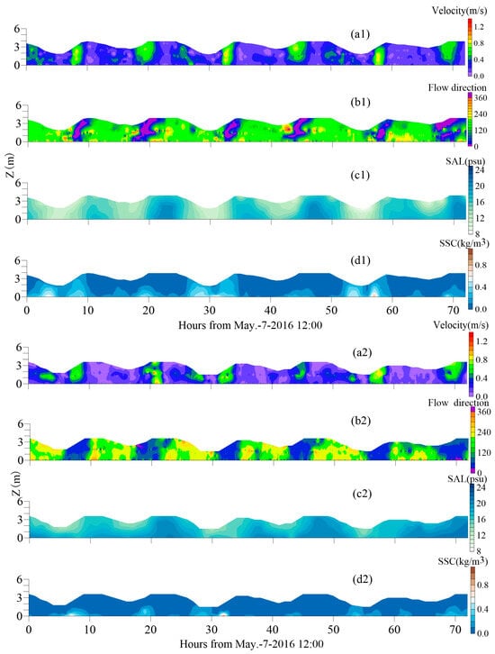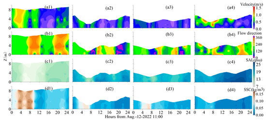 The time series of flow velocity, flow direction, salinity, and SSC at observation stations during 12–13 March 2013, 7–10 May 2016, and 12–13 August 2022 are depicted in Figure 2, Figure 3 and Figure 4. Table 2 provides information about flood and ebb flow velocities, duration, average water depth, SSC, and dominant flow in ZHE.