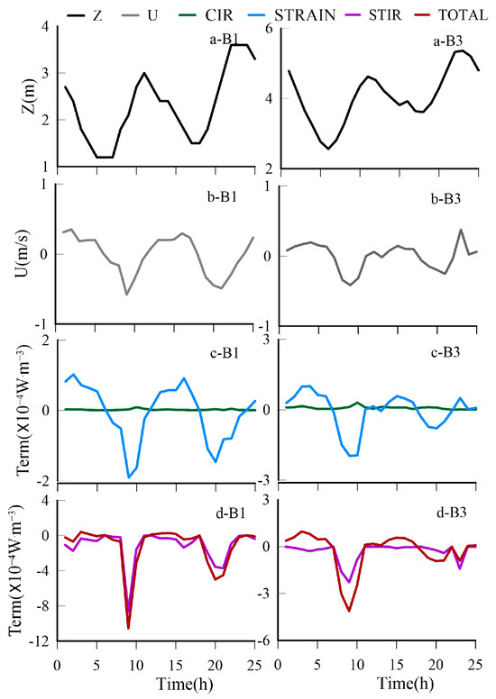 The water depth, depth-averaged velocity, (∂φ/∂t)strain, (∂φ/∂t)cir, (∂φ/∂t)stir, and (∂φ/∂t)total at B1 and B3.