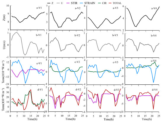 The water depth, depth-averaged velocity, (∂φ/∂t)strain, (∂φ/∂t)cir, (∂φ/∂t)stir, and (∂φ/∂t)total at V1–V4.