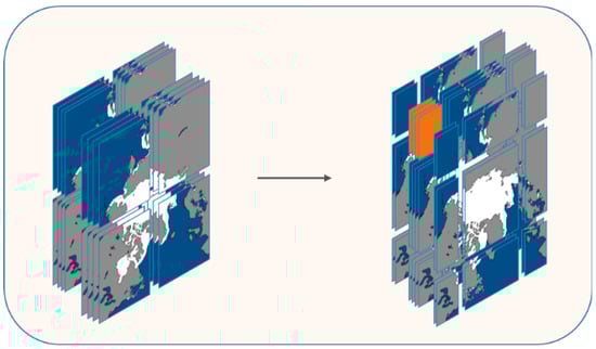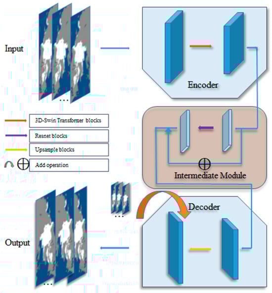 The Swin Transformer establishes connections between non-overlapping windows without adding new windows, which takes into account both local and global features and effectively reduces the computational complexity. Our 3D-Swin Transformer [] extends this operation to the temporal channel to implement a sliding window mechanism in space–time. It helps the model to perform window sliding in the spatial and temporal channels simultaneously and to compute spatial and temporal attention scores simultaneously, thus effectively extracting the features of a particular location at a particular time and its spatio-temporal relationship with neighbouring locations and adjacent times. This is one of the most important parts of the spatio-temporal prediction work. This design is well suited to extracting high-resolution spatio-temporal data like sea ice concentration, as shown in Figure 3