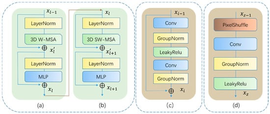 We form a 3D-Swin Transformer module by combining the two modules of window attention and sliding window attention—see (a) and (b) in Figure 4—with being the data before they enter the module and being the output data. This process can also be expressed by Equations (4)–(7).