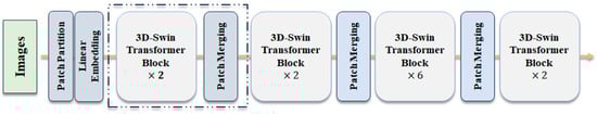 After one 3D-Swin Transformer module, feature extraction is completed. As previously stated, our encoder employs a hierarchical structure analogous to that of a convolutional neural network (CNN). After a specified number of 3D-Swin Transformer modules, a downsampling operation is conducted with the objective of reducing the image size in order to extract features from the data at varying scales. This downsampling is achieved through patch merging.