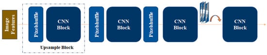 The decoder is an upsampling module with PixelShuffle [] as its core. Its core idea is to rearrange and utilise the channel dimensions of the feature map of a low-resolution image. Its internal operation can be divided into two steps. First, a convolutional layer with a convolutional kernel of is used to increase the number of channels of the feature map, while feature fusion and dimensionality reduction are performed. Next, the pixel reorganisation work is carried out, i.e., the elements of each channel are rearranged in the spatial dimension, and the original is adjusted to . In this way, the information that was originally concentrated in the channels is dispersed to the spatial dimension, which achieves the purpose of upsampling, while more information is retained. Compared to methods such as neighbourhood interpolation or bilinear interpolation alone, PixelShuffle can be trained end to end with other convolutional layers, adapting to specific data distributions and task requirements to produce higher-quality images. It is especially good at recovering high-frequency details, thus better capturing sea ice concentration reconstruction details. In accordance with our prediction task, there is a transformation of temporal information into spatial information, which is particularly conducive to spatio-temporal prediction. Based on this feature, we designed a CNN module after each upsampling so that an upsample block was composed; see (d) in Figure 3. The whole decoder consists of three upsample Blocks, with a CNN block connected at the end; see Figure 7. It should be noted that the data features are summed with the original data at the pixel level before they are fed into the last block, which is actually equivalent to a shortcut that spans the whole model. It is a residual structure which further ensures the stability and generalisation ability of the model.