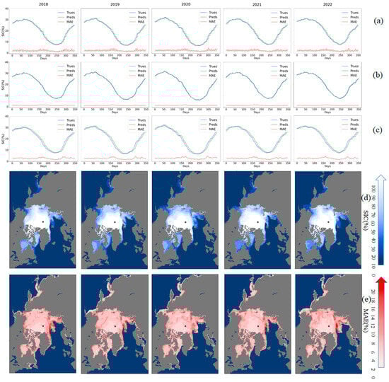The MAE and MAPE are calculated by spatially averaging the data, followed by temporal averaging. Preds are set to denote the predicted values of the grid, Trues denote the ground values of the grid (NSIDC), and the formulas for the four metrics are shown in Equations (10)–(13). For MAPE, if the denominator is zero, we replace it with 0.1.