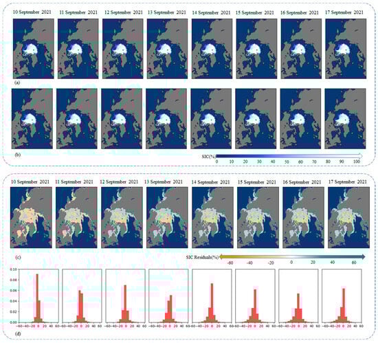 Figure 9c illustrates that our model tends to underestimate the sea ice concentration in areas where the variability is relatively more pronounced. This is a prediction error resulting from the complex ice conditions at the common edge of the sea ice and the coastline. Conversely, our model tends to overestimate the sea ice concentration in areas of coastline and gentler variability, where these errors are relatively small and the colour blocks are lighter, and there is a component of random error in these small errors. This is also well illustrated in Figure 9d, where our error histograms demonstrate that the majority of the errors are within the range of (−20%, 20%), particularly during the initial three days, which exhibit a high concentration of errors. Although a small number of errors exceed 20 percent in the next four days, the majority of the errors remain within the range of (−20%, 20%). For the sake of clarity, the distribution of the errors is more accurately represented in Figure 9 by the exclusion of errors with values within the range (−0.5, 0.5). This range encompasses both open water and some potential random errors.