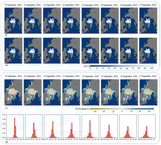 Figure 9a,b illustrate the spatial distribution of the predicted and true non-land sea ice concentration for a single day between 10 September and 17 September 2021. Figure 9c depicts the spatial distribution of the residuals of the non-land grid for a single day, which is obtained by subtracting the predicted value from the true value. Overall, the spatial distributions of the predicted and true values exhibit a high degree of overlap, indicating the excellent prediction performance of SICFormer.