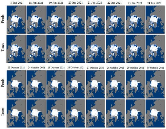 To further demonstrate the model’s capacity to capture these dynamics, we selected the periods with the largest errors in Figure 8a for display: days 168–175 and days 296–303 in the year 2021. In other words, the periods from 17 June to 24 June and from 23 October to 30 October in the same year correspond to the melting and freezing periods for sea ice, respectively. As illustrated in Figure 11, the sea ice freezing area is relatively extensive during these two periods, which may be a contributing factor to the significant error observed in this period. The predicted values are in close agreement with the true values in terms of their spatial detail. This demonstrates that the model has the capacity for generalisation.