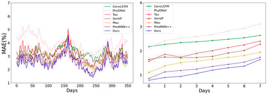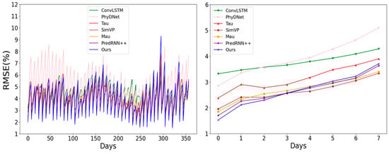 Figure 13 illustrates the full-year RMSE fluctuations for 2022, as well as the RMSE variations observed during the 17–24 September and 23–30 October cycles. It can be observed that the model demonstrates a consistently lower level throughout the majority of the year. With the exception of a lower and higher extreme value observed around days 250 and 300, respectively, the changes are relatively consistent. The results displayed in the right graph indicate that the initial three days of a cycle exhibit the lowest values for the RMSE. The RMSE values for the final three days exhibit a slight increase in comparison to those of models such as SimVP yet remain within a comparable range. This illustrates that there is scope for further enhancement of the model in terms of its stability and long-term predictive capability. In conjunction with the MAE line graph, our model exhibits the lowest combined error and demonstrates a competitive forecasting performance.