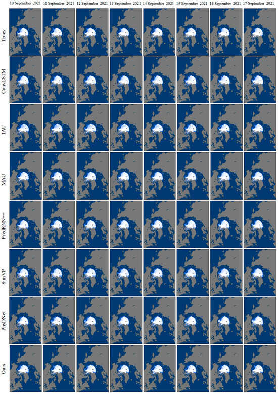 In order to facilitate a more comprehensive comparison of the models’ predictive abilities with regard to dates that are further away, the eighth day of each prediction cycle is taken as the predicted value. Figure 12 illustrates the change in error for each model in 2022, as well as the change in error from 10 September to 17 September. The results demonstrate that our models exhibit the lowest mean absolute error (MAE) for the majority of the year, particularly during the summer months when the sea ice concentration is minimal. This is a period when the sea ice conditions are more complex, with frequently varying sea ice concentrations at the sea ice edge. It is also the time of year when Arctic activity is at its peak, for which accurate prediction is critical. Figure 12 also shows that the prediction error increases as the prediction date increases within a prediction period, a phenomenon common to all the experimental models.