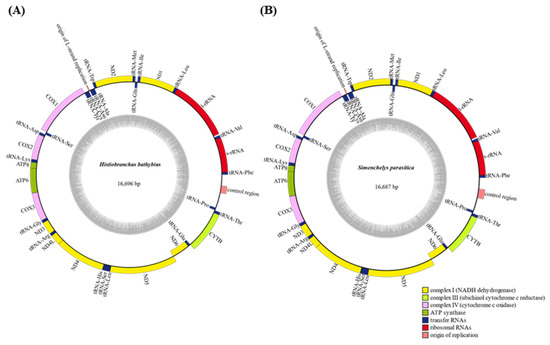 The fish tissue samples were preserved at −20 °C until DNA isolation. Genomic DNA was extracted from the muscle using a DNeasy Blood & Tissue Kit (Qiagen, Valencia, CA, USA), following the manufacturer’s protocol. The quantity and quality of the isolated DNA were analyzed and measured at 230, 260, and 280 nm using a NanoDrop One spectrophotometer (Thermo Fisher Scientific Inc., Madison, WI, USA). Whole-genome sequencing was performed using the Illumina NovaSeq 6000 platform at the National Instrumentation Center for Environmental Management (Seoul, Republic of Korea). The complete mitogenomes of the two deep-sea eel specimens were assembled and annotated using MitoZ [27]. The circular maps of the mitogenomes of H. bathybius and S. parasitica were drawn by the GeSeq tool (https://chlorobox.mpimp-golm.mpg.de/geseq.html; accessed on 10 June 2024) [28].