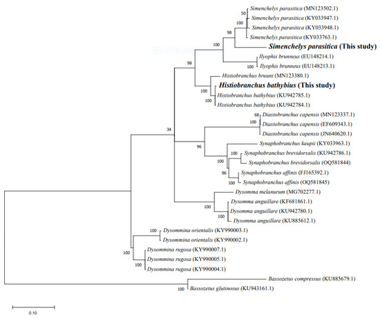 To construct a molecular phylogenetic tree, a total of 24 mtDNA COI sequences from the eel family Synaphobranchidae (genus: Simenchelys, llyophis, Histiobranchus, Dysomma, Dysommina, Diastobrachus, and Synaphobranchus) were downloaded from the GenBank (Supplementary Table S2). The nucleotide sequences of the individual mtDNA COI genes were aligned using the ClustalW algorithm in the MEGA software (ver. 11.0.1; Centre for Evolutionary Medicine and Informatics, Tempe, AZ, USA). To establish the best-fit substitution model for phylogenetic analysis, the model with the lowest Bayesian information criterion and Akaike information criterion scores was estimated using a maximum likelihood analysis. According to the model test results, maximum likelihood phylogenetic analyses were performed with the LG + G + I model using the MEGA software. Support for nodes was calculated using 1000 bootstrap replicates.