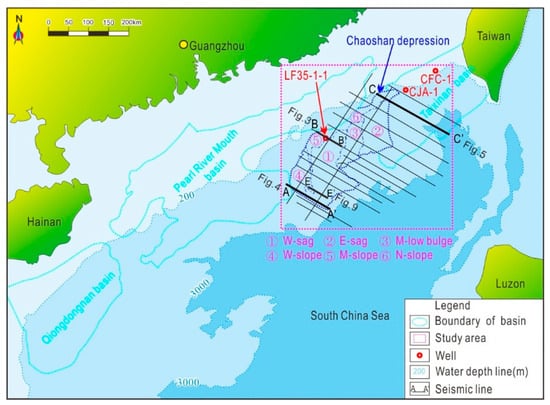 - Hao, H.; Shi, H.; Zhang, X.; Wang, T.; Tang, S. Mesozoic sediments and their petroleum geology conditions in Chaoshan sag: A discussion based on drilling results from the exploratory well LF35-1-1. China Offshore Oil Gas 2009, 21, 151–156. Available online: https://en.cnki.com.cn/Article_en/CJFDTOTAL-ZHSD200903001.htm (accessed on 20 February 2024).