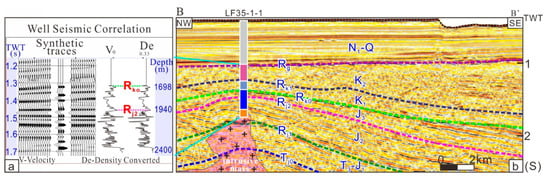 Seismic profile (BB’) across the northern SCS, running from northwest to southeast: (a) well seismic correlation of LF35-1-1; (b) reflecting the boundaries calibrated by synthetic traces (see Figure 1 for the location).