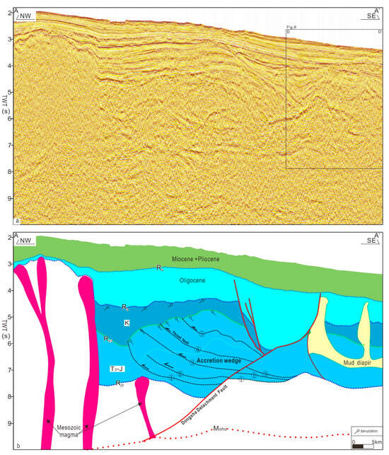 Seismic profile AA’ across the northern SCS, running from northwest to southeast, showing accretion wedges, mud diapers, and detachment fault ((a) seismic profile; (b) interpretation profile showing erosion at the top of the Jurassic and Cretaceous, accretion wedges, and mud diaper).