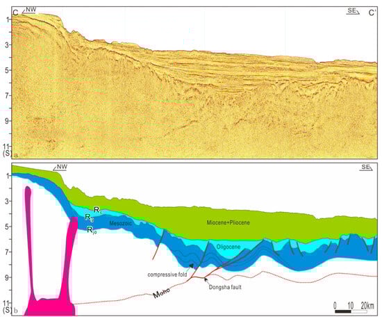 Seismic profile CC’ across the northern SCS, running from northwest to southeast; Moho can be traced distinctly, presenting a laterally semi-continuous reflection ((a) seismic profile; (b) Moho, with a compressive fold and Dongsha fault able to be interpreted).