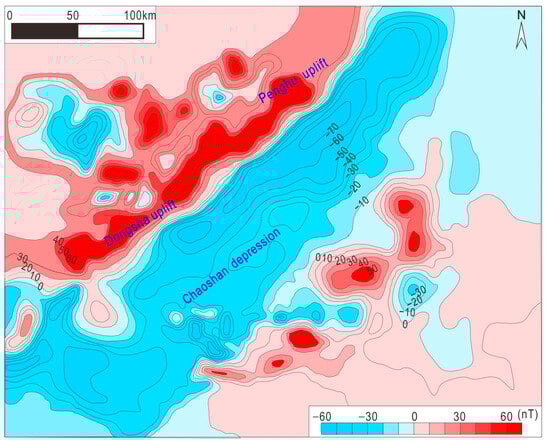 The amplitude of polar magnetic anomalies in the study area ranges from −80 to 250 nT, exhibiting a large number of magnetic anomalies from the Dongsha uplift to the Penghu uplift, forming a northeast-oriented zone with a large number of magnetic anomalies (Figure 6). The CSD is mainly characterized by negative magnetic anomalies, and the southeast CSD also exhibits many magnetic anomalies, but their amplitudes are relatively low. Overall, a clear zoning feature of “high in the north and south, and low in the middle” can be seen (Figure 6). Based on magnetic anomaly wavelet decomposition and seismic interpretation, the distribution of igneous rocks is delineated. The igneous rocks on the northwest side of the CSD have source depths that are mostly greater than 2 km, intrude into the Mesozoic, and are mainly medium acidic, while the igneous rocks on the southeast side of the CSD are mostly exposed to the seabed in the form of eruption and are mainly medium basic; the distribution of igneous rocks in the depression is relatively rare. The Dongsha high magnetic anomaly field is a reflection of the Mesozoic subduction and accretion of intermediate acidic volcanic rocks with high residual magnetic strength (Figure 7), which is the result of the Mesozoic subduction process.