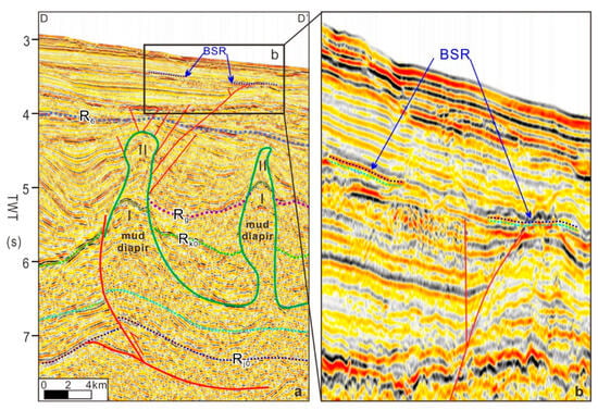 Seismic profile DD’ showing a mud diaper ((a) biphasic development of a mud diaper; (b) is the enlargement of box b in the left figure, showing seismic track polarity inversion of BSR (blue line) and normal seismic tracks (green line)).