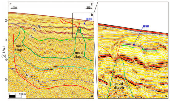 Seismic profile EE’ showing a mud diapir ((a) biphasic development of a mud diaper; (b) is the enlargement of box b in the left figure, showing seismic track of a BSR (blue line) and truncated normal seismic tracks (green line)).
