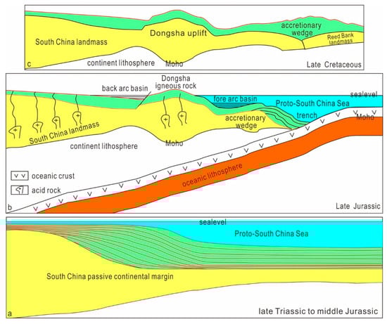 Mesozoic tectonic evolution is closely related to subduction. The DSWs have gone through six stages of tectonic evolution in the Mesozoic and Cenozoic eras, namely, a rifting period (T3), a depression period (J), a tectonic uplift period (J3), a re-subsidence period (K1), a tectonic inversion period (K2), and a regional thermal subsidence period (the Neogene) [93,94,95,96,97,98]. The ancient Pacific lithosphere subducted northwest beneath the lithosphere of the South China continent. In front of the volcanic arc, a forearc basin developed, while behind the volcanic arc, a small post-arc extensional basin developed. In the late Early Cretaceous, the ancient SCS oceanic lithosphere had almost subducted, and the Nansha and South China landmasses collided and continued to compress in the northwest direction (Figure 10). The stratigraphic unconformity between J and K is the result of the Dongsha subduction. The subduction began in the Late Jurassic and collided with the South China landmass during the Late Cretaceous. The northeastern SCS uplifted, and the Middle and Upper Jurassic eroded, forming an angular unconformity interface between the Jurassic and Cretaceous. The evolution of the Dongsha subduction zone can be divided into two stages: (1) in the Late Jurassic, the ancient Pacific plate began to subduct in the NWW direction, and the Dongsha subduction zone already existed as a large subduction zone boundary; (2) in the Late Cretaceous, the subduction continued, and the Reed Bank landmass collided with the South China landmass, causing the ancient SCS to contract and disappear. The corresponding part of the accretion zone has a steep, downward sloping Moho towards the north, with the buried depth of the Moho dropping sharply from 16 km to 26 km. The Dongsha high-magnetic-anomaly zone on the northwest side of the subduction accretion zone is an igneous rock zone that is associated with the Mesozoic subduction.