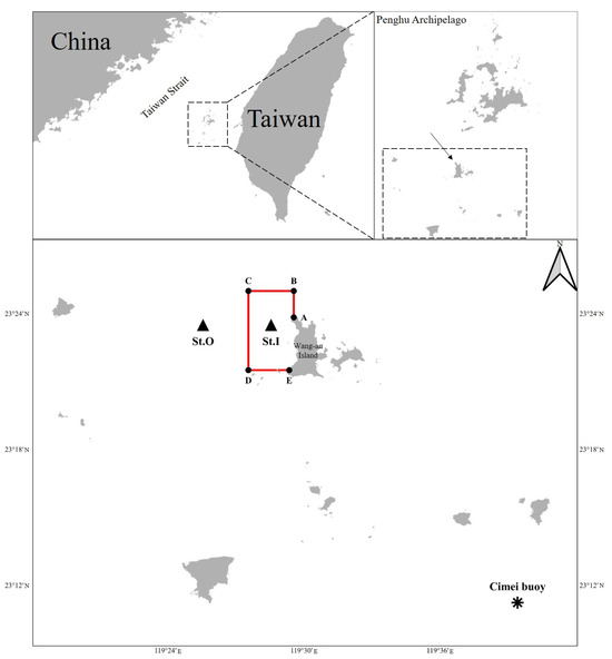 Taiwan is located in East Asia and is surrounded by sea on all sides, with the Pacific Ocean to the east, the Taiwan Strait to the west, the Bashi Channel to the south, and the East China Sea to the north [1]. The Penghu archipelago is located in the Taiwan Strait between Taiwan and China and is strongly influenced by the East Asian monsoon. Wind stress is the primary factor influencing oceanic transportation in this area [2]. According to local government statistics [3], the Penghu archipelago comprises 90 islands, of which Wang-an Island, located at 23°21.433′ N and 119°30.017′ E, is the fifth largest. Because of this island’s topography and seasonal monsoons, the sea surrounding Wang-an Island experiences upwelling, resulting in an abundance of sea nutrients. The complex currents and changing hydrological patterns in this sea make it a crucial migratory route and spawning ground for various marine species [4,5].