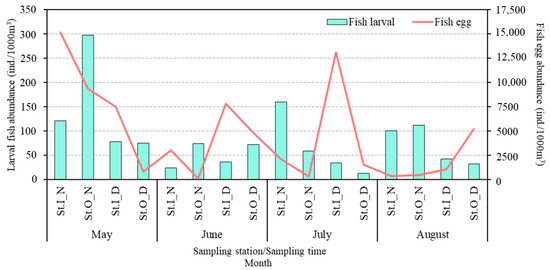 Figure 2 illustrates the abundance of larval fish and fish eggs across the 16 sampling events. The results indicated that larval fish abundance ranged from 12.85 to 297.29 ind./1000 m3, with the average abundance being 83.1 ± 67.3 ind./1000 m3. Fish egg abundance ranged from 103.41 to 15,129.05 ind./1000 m3, with the average abundance being 4541.5 ± 4635.1 ind./1000 m3. The highest larval fish abundance was recorded outside the restricted zone during the night in May, whereas the lowest larval fish abundance was recorded in the same area during the night in July. For fish eggs, the highest abundance was recorded inside the restricted zone during the day in May, whereas the lowest abundance was recorded outside the restricted zone during the night in June. Overall, the abundances of both larval fish and fish eggs exhibited spatiotemporal variations in the surveyed waters, with the highest abundance typically occurring in May. In addition, the larval fish and fish eggs sampled during the night generally exhibited higher abundance than did those sampled during the day.