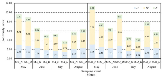 This study computed the Shannon–Wiener diversity index (H′) [34], Pielou’s evenness index (J′) [35], and Margalef’s richness index (D′) [36] to understand the variations in the species diversity of larval fish in the waters of the restricted fishing zone surrounding the Wang-an light fishery. The formulas for the aforementioned parameters are expressed as follows:
