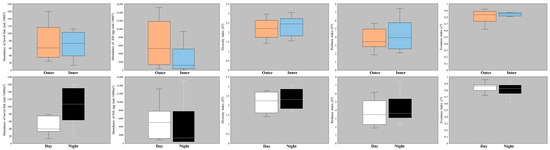 Box plots illustrating the abundance of larval fish and fish egg, as well as the diversity index, richness index, and evenness index. The data are shown for both inner and outer (top panel), and for day and night (bottom panel) during 2022.