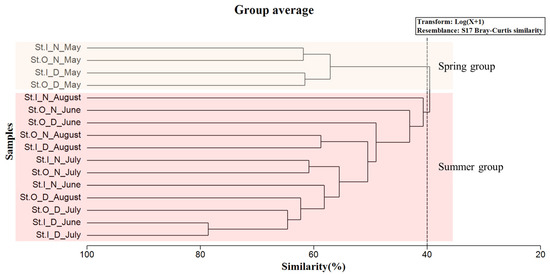 We also performed cluster analysis (CA) to determine the community structure of larval fish in the different sampling events. Before CA was conducted, the Bray–Curtis similarity index [31] was employed to analyze the similarity of the larval fish composition across various sampling events. This index is expressed as follows: