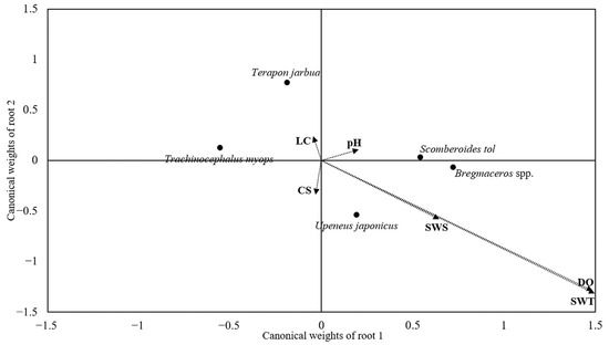 To further analyze the effects of oceanographic factors on larval fish in the waters off Wang-an Island, this study conducted CCA by using the collected environmental data (SWT, SWS, DO, pH, CV, and LC) and the abundance data for species that were collected in all the sampling events (U. japonicus, T. myops, S. tol, T. jarbua, and Bregmaceros spp.). Table 5 indicates that the total redundancy percentages of the environmental and biological variables were 67.37% and 66.66%, respectively. The top-two canonical axes of the CCA factors revealed significant differences between the environmental and biological variables (p < 0.05; Table 6). Therefore, the canonical weights corresponding to the environmental and biological variables of the first two canonical axes were plotted on a two-dimensional plane (Figure 6). The results revealed that the abundance values of U. japonicus, S. tol, and Bregmaceros spp. had positive correlations with SWT, SWS, and DO, whereas the abundance values of T. jarbua and T. myops exhibited negative correlations with SWT, SWS, and DO. Moreover, pH, CV, and LC had relatively low correlations with the abundance values of the aforementioned five larval fish species (canonical weights < ±0.5).