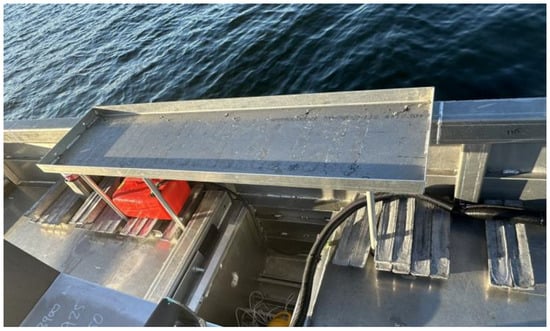 Solid ballast racks were positioned below deck, on deck, and on the gunwale, to contain the lead inclining mass and to vary the VCG, mitigating any free-surface effect on results from using liquid ballast. The gunwale rack is clearly shown in Figure 4. Forty-two 25 kg lead ingots were used as the adjustable ballast. The vessel has a displacement of 3.77 tonnes when all the ballast is loaded. The only variable load during the experiment was due to fuel burn with a maximum variation in the order of only 10–20 kg.