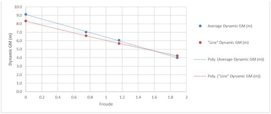 The stability of displacement vessels is understood through the calculation of a heeling and righting moment plotted on a righting arm (GZ) curve [,,]. This method has proven to be a reliable predictor of hydrodynamic stability for displacement vessels, as the waterline relative to the vessel’s displacement is largely the same when the vessel is static or dynamic [,,,]. When the same approach is applied to a planing mono-hull, the result again provides a reliable predictor, not because the righting moment accurately predicts the vessel’s hydrodynamic stability, but rather because the hydrodynamic support, as described by Blount [,], creates its own righting moment, separately, but in parallel to the role of gravity and buoyancy as seen in a GZ curve. The quantum of the hydrodynamic lift, correlated to the vessel’s speed, also works to right the vessel.