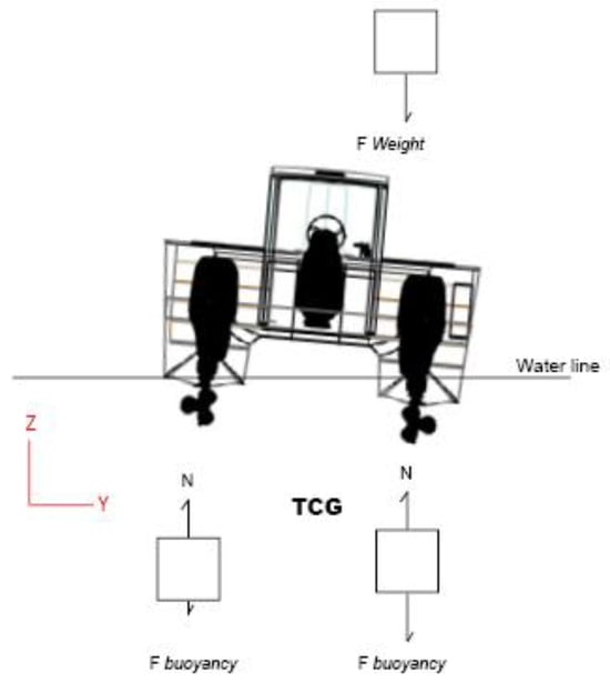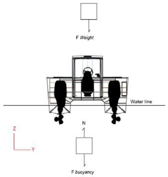 The literature on vessel stability uses static measurement and analysis to determine heeling and righting moments [,]. Using the vessel’s VCG and metacentric height (GM), the force required to move the vessel to a predicted heeling moment can be calculated. This approach allows for plotting a GZ curve and identifying residual stability.