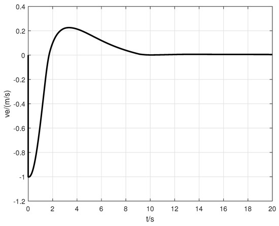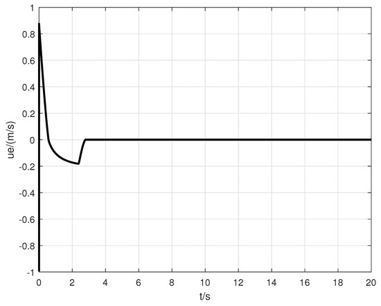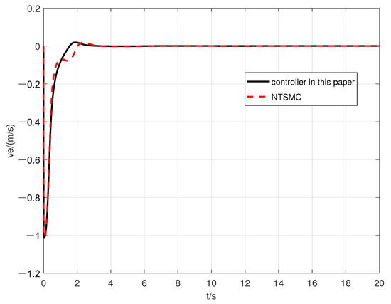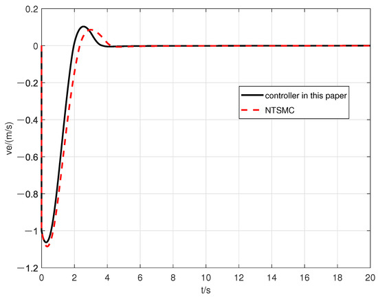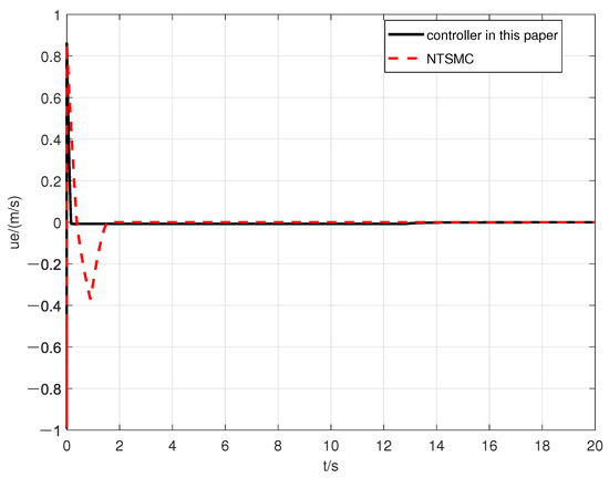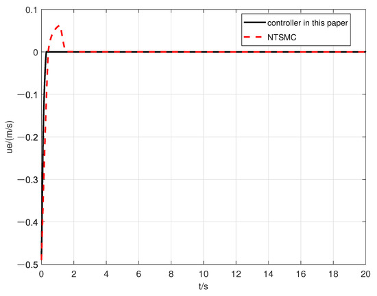 Figure 7 shows the curves of forward and backward velocity error . From Figure 7, can converge to 0 with the two controllers in a finite time. Under the action of the designed controller, the desired forward and backward speed is tracked at 0.4 s. Under the action of NTSMC, converges to 0 within 1.58 s. Thus, the tracking effect with the designed controller is better.