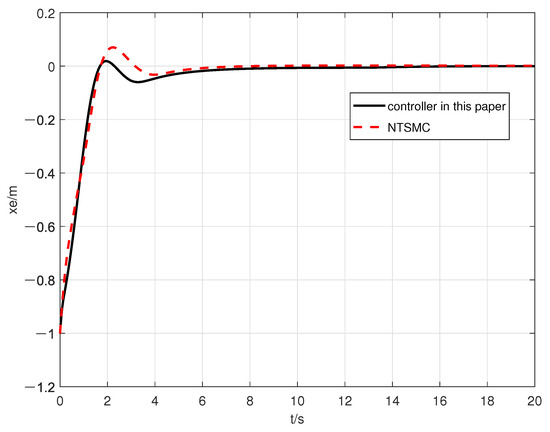 The parameters are chosen as , , , , , , , , , , . Similarly, the simulation results are compared with the NTSMC, as shown in Figure 7, Figure 8, Figure 9, Figure 10 and Figure 11.