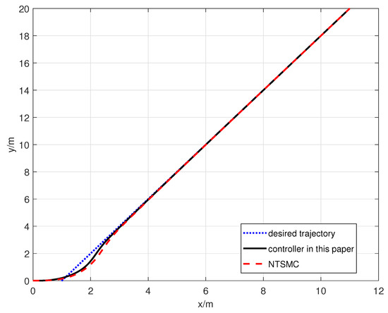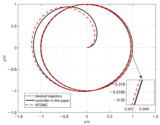 Figure 11 shows the actual motion trajectory of the underactuated AUV with two controllers. It is shown that both controllers can achieve trajectory tracking, and the tracking performance with the designed controller is better. By comparison, the tracking performance with the designed controller is better than NTSMC, making the underactuated AUV have faster tracking speed.