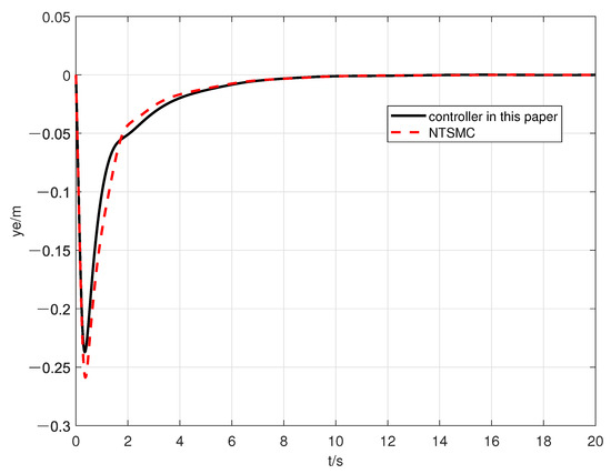The curves of lateral velocity tracking error are shown in Figure 8. The designed controller enables to converge to 0 within 2.5 s. NTSMC makes the converge to 0 within 3.3 s. Under the action of these two controllers, can converge to 0 in a finite time, and the designed controller makes the convergence speed of lateral velocity error faster.