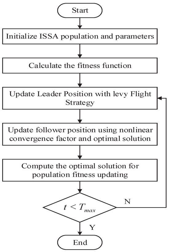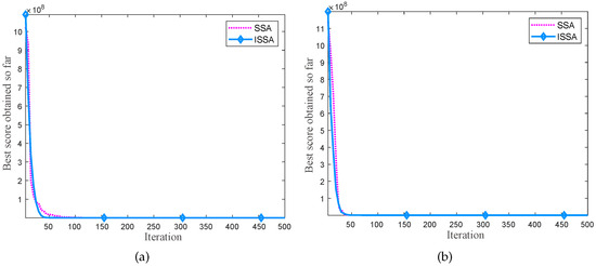 The comparison of the ISSA with the standard SSA on the CEC2021 benchmarking functions, as presented in Table 2, indicates that the ISSA optimization accuracy for the F1 function is marginally lower than that of the SSA. However, the ISSA exhibits enhanced optimization accuracy across the remaining tested functions compared to the SSA. Notably, on complex multi-modal functions such as F2–F7, the ISSA significantly outperforms the SSA, demonstrating a superior capability to escape the local optima. The STD values of the ISSA are generally lower than those of the SSA, suggesting that the ISSA results are more stable and consistent. As evidenced by the mean values in Table 3, the ISSA achieves higher accuracy in identifying the optimal solutions for the CEC2021 multi-dimensional composite functions across all tested cases. This improvement is attributed to the effective acceleration of the convergence speed facilitated by the Levy flight strategy and nonlinear convergence factor. Overall, the ISSA demonstrates enhanced convergence speed and accuracy relative to the standard SSA.