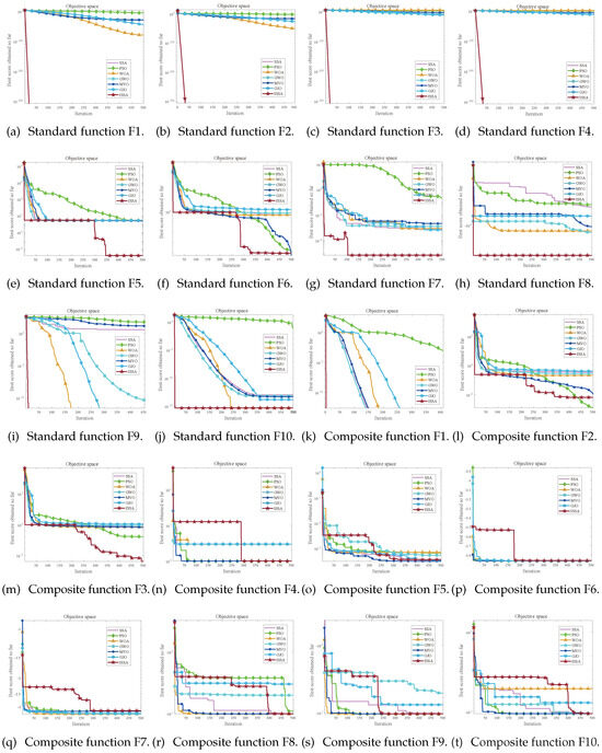 The computational results of the seven algorithms for the 10 test functions are shown in Figure 5. It can be seen from the figure that the ISSA has less error and more accurate results than the other six algorithms. The side shows that the ISSA has the optimal iteration results. It shows that the ISSA has good stability compared to other algorithms. From the convergence curves in Figure 5, it is evident that the ISSA exhibits continuous convergence across different test functions, with a convergence speed significantly faster than other methods. As shown in Figure 5e–g,m–t, once the ISSA fitness values reach a certain magnitude, its convergence speed markedly outperforms that of other algorithms. This indicates that the ISSA also demonstrates superior ability to escape from local optima.