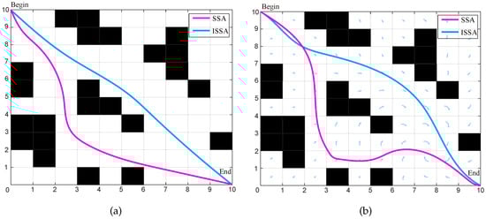 The grid map is used for constructing the simulation environment due to its simplicity and efficiency. This method involves dividing a two-dimensional plane into grids of equal length and width, each with a side length of one. In the encoding process, the value one represents obstacles, which are depicted as black areas in the environmental model, while zero represents unobstructed grids, shown as white areas. The grid environment for AUV path planning is illustrated in Figure 6, with the starting point coordinates at (0, 10) and the endpoint coordinates at (10, 0). The SSA and ISSA are used for 2D path planning of the AUV. The initial overall number is 50, and the maximum number of iterations is 500. Figure 6a represents the optimal paths of the two algorithms. It is clear to see that the path under the optimization of the ISSA is shorter. Figure 6b represents the 2D path planning of the AUV under the influence of vortices. Under the influence of eddy currents, the AUV path to the end point has a slight deviation, but the ISSA still shows a clear advantage. The iterative curves of AUV 2D path planning by the SSA and ISSA are shown in Figure 7. Table 4 shows the comparison results of the two algorithms for 2D path planning.