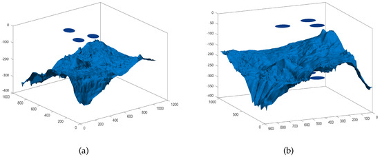 The marine environment is distinguished by its unique features and inherent complexity, predominantly reflected in the shifting nature of maritime weather conditions and the flow of seawater. Additionally, the environment is marked by the intense pressure and frigid temperatures present at great ocean depths, as well as the aggressive corrosiveness of seawater. In addition, there are some unobservable and complex environments in the marine environment, such as reefs and undercurrents. At the same time, some mesoscale and submesoscale eddies are also an important part of the complex environment of the marine environment. The complex marine environment is constructed as shown in Figure 8, which includes marine sediments, reefs, and eddies.