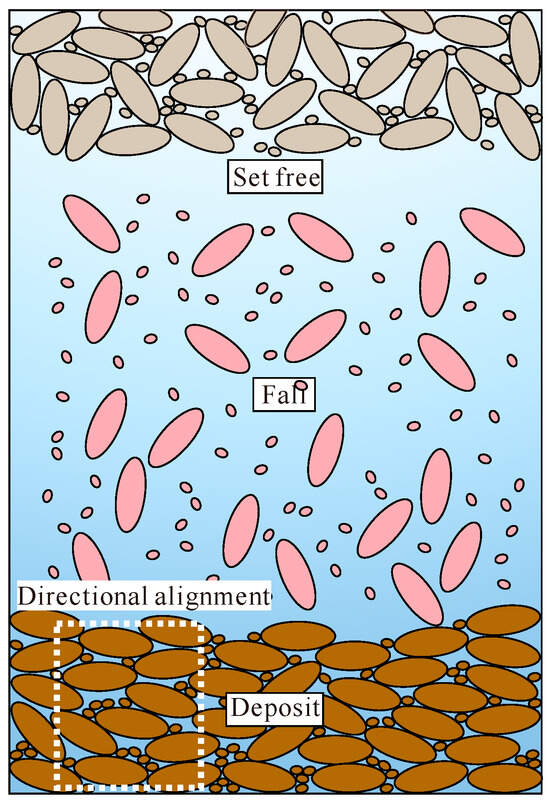 For the pluviation method, the physical process mainly includes the following: (1) particle release, where sand particles are released through the screen and freely fall from a certain height; (2) particle descent, where sand particles descend in water under the action of gravity and medium resistance; (3) particle collision and rebound, where sediment particles collide and bounce off each other upon contact, and specific collision angles and particle shapes cause the particles to rotate and rearrange; (4) sedimentation stabilization, where the kinetic energy of the particles gradually dissipates during the process of collision–rebound–collision, leading to a continuous decrease in particle velocity until it reaches 0 at a specific location.