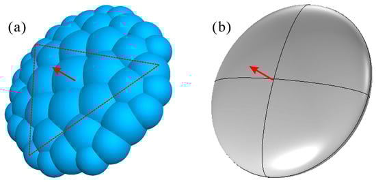 Characterization of non-spherical particles and extraction of attitude angle: (a) particle flow method; (b) finite element method, the red arrows represent normal vectors.