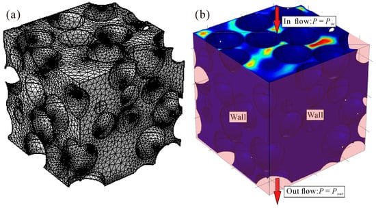 The flow field in the pore space of each sample can be obtained by solving all the governing equations in COMSOL Multiphysics (refer to Figure 6). Water is selected as the test fluid. The outlet velocity Uout is calculated through fluid mass integral, which can then be inserted into Equation (7) to determine the permeability in each direction.