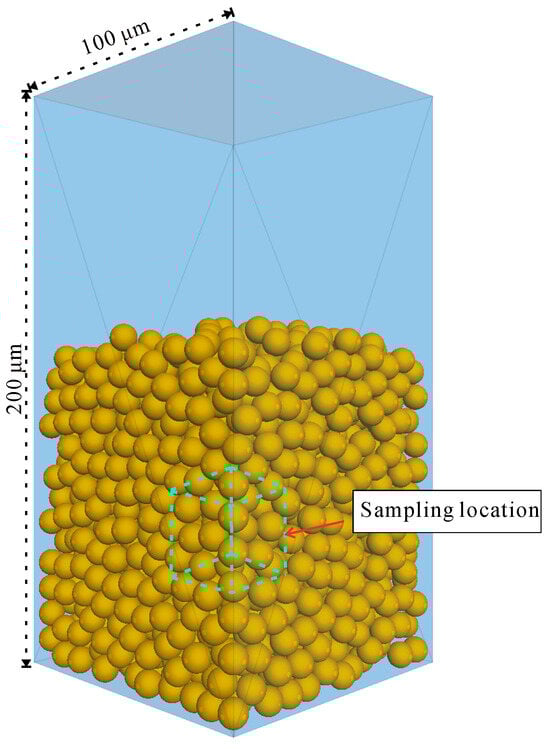 After particle generation, the process of pluviation is simulated with the particle flow method (Figure 2). Theoretically, for the descent of particles, Newton’s second law is employed to depict the translational motion of particles []: