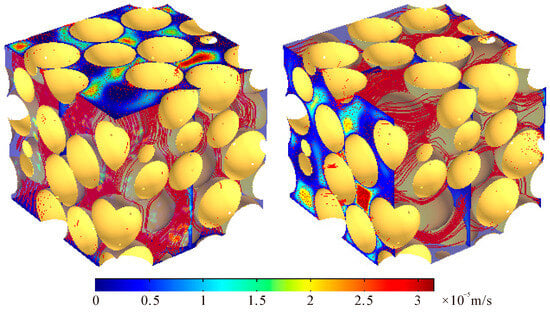 With the above CFD simulation method, the flow field in pore space of each sample can be obtained by solving all the governing equations in COMSOL Multiphysics (see Figure 6). Water is chosen to be the test fluid with the physical parameters shown in Table 1. The outlet velocity Uout is determined through the integration of fluid mass, which can then be utilized in Equation (7) for the calculation of permeability in each direction. According to the simulation results, the horizontal permeability kh and vertical permeability kv are 84.33 and 81.45 mD, respectively, resulting in kv/kh = 0.97. Therefore, the porous media consisting of identically sized spherical particles exhibits limited anisotropy in permeability. The seepage in the pore space is governed by the prevailing channels, with flow lines being concentrated within the larger pores.