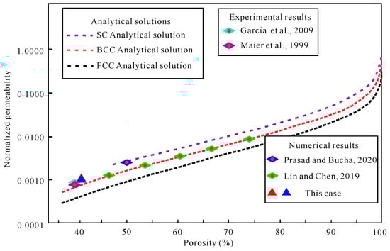 Additionally, previous studies have reported more experimental and numerical results. For instance, Maier et al. and Garcia et al. conducted experiments to test the normalized permeabilities P (P = k/a2), with a porosity of 0.37, yielding results of 7.48 × 10−4 and 8.24 × 10−4, respectively [,]; Lin and Chen [], Prasad and Bucha [] computed the permeabilities at different porosities using the Lattice Boltzmann method. The analytical, experimental, and numerical findings from these studies exhibit a high level of consistency with this work (see Figure 7). Therefore, the proposed method has a considerable level of accuracy and applicability.