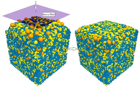 The numerical samples are established based on the microstructure and mineral characteristics of hydrate-bearing sediments in the Shenhu area, South China Sea, incorporating plate-shaped, elongated, and spherical particles (for more details, refer to our previous study by Li, Zhang []). The predominant minerals present in this reservoir comprise calcite (foraminifer), clay minerals, quartz, and plagioclase []. The distinguishing mineral characteristic of this reservoir, in comparison to other hydrate reservoirs, lies in its substantial clay component, which often exhibit elongated and plate-shaped geometrical shapes [,]. The horizontal permeability kh and vertical permeability kv for uncompacted sediments are, respectively, 24.31 mD and 13.72 mD with kv/kh = 0.56. As comparisons, the permeability anisotropy for cores from India’s National Gas Hydrate Program Expedition 02 exhibits kv/kh = 0.54, while the result for pressure-core sediments recovered from the Krishna–Godavari Basin, offshore India, is 0.25 [,]. It has been indicated that the plate-shaped is the cause of permeability anisotropy. In this work, the impact of compaction is further investigated. According to the theoretical calculation, the in situ compaction stress has the potential to reach 15.24 MPa []. Therefore, loads are applied to the model in stages from 0 to 16 MPa (1 MPa per stage) with a servo wall boundary (see Figure 8). At each stage, seepage simulation is conducted and the evolution of permeability anisotropy is computed.